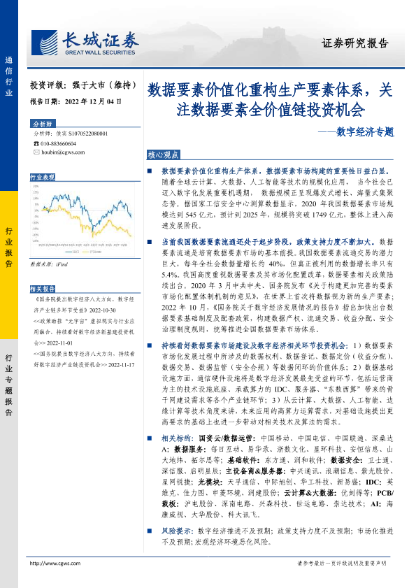 【长城证券】【20221204】通信行业:数字经济专题-数据要素价值化重构生产要素体系,关注数据要素全价值链投资机会-12页