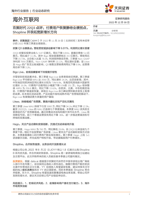 【天风证券】【20221209】欢聚时代22Q3点评:付费用户恢复静待业绩拐点,Shopline并表拓宽新增长方向-11页
