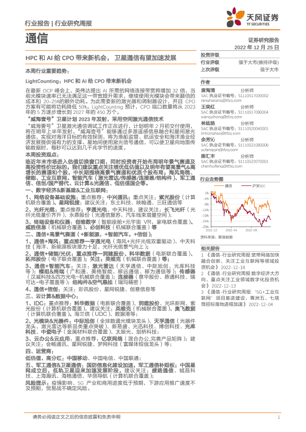 【天风证券】【20221225】通信行业研究周报:HPC和AI给CPO带来新机会,卫星通信有望加速发展-12页