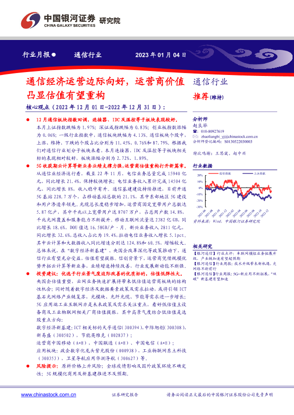 【银河证券】【20230104】通信行业行业月报:通信经济运营边际向好,运营商价值凸显估值有望重构-19页