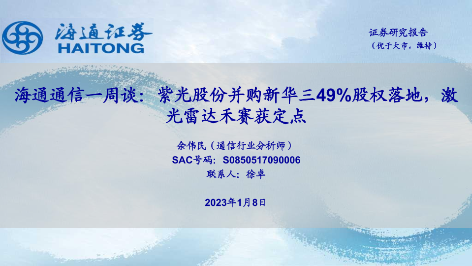 【海通证券】【20230108】海通通信一周谈:紫光股份并购新华三49%股权落地,激光雷达禾赛获定点-12页