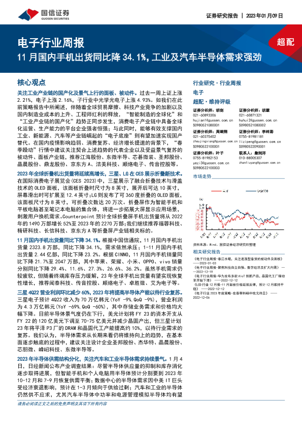 【国信证券】【20230109】20230109-国信证券-电子行业周报:11月国内手机出货同比降34.1%,工业及汽车半导体需求强劲-13页