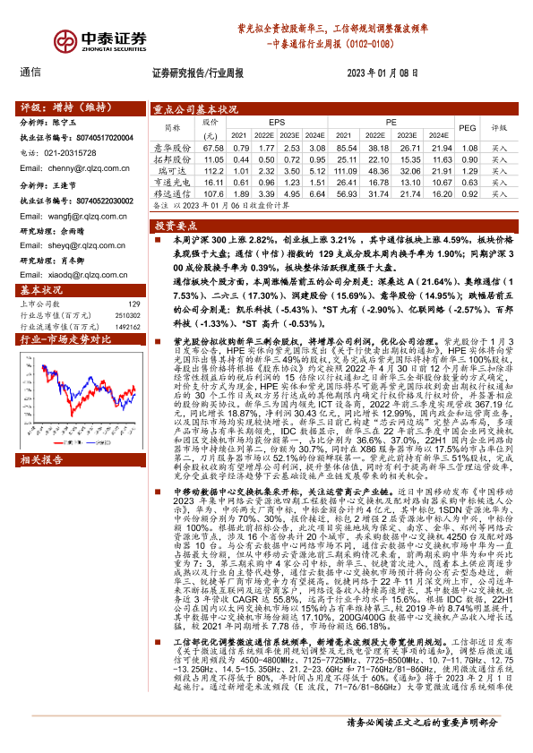 【中泰证券】【20230108】中泰证券-中泰通信行业周报:紫光拟全资控股新华三,工信部规划调整微波频率-22页