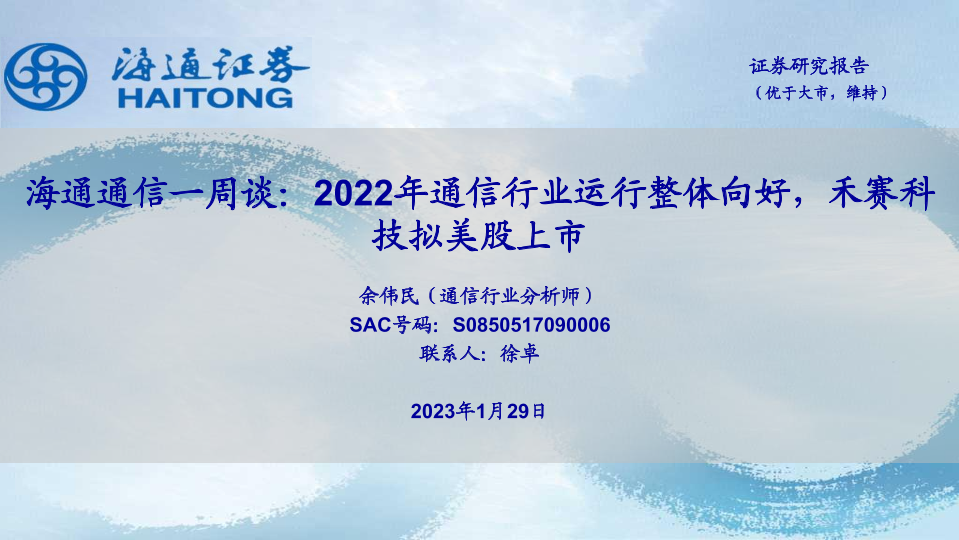 【海通证券】【20230129】20230129-海通证券-海通通信一周谈:2022年通信行业运行整体向好,禾赛科技拟美股上市-12页