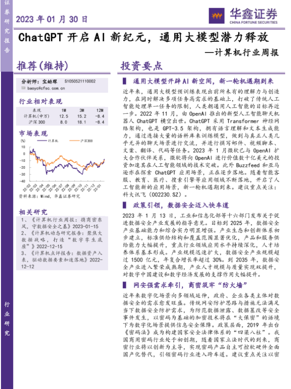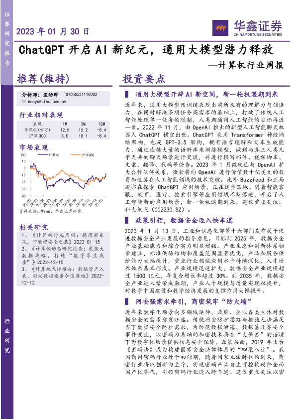 【华鑫证券】【20230130】20230130-华鑫证券-计算机行业周报:ChatGPT开启AI新纪元,通用大模型潜力释放-21页