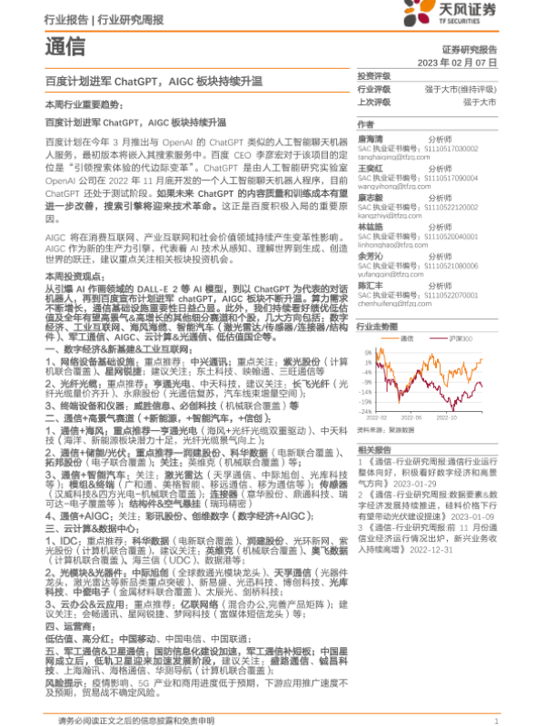 【天风证券】【20230207】通信行业研究周报:百度计划进军ChatGPT,AIGC板块持续升温-12页