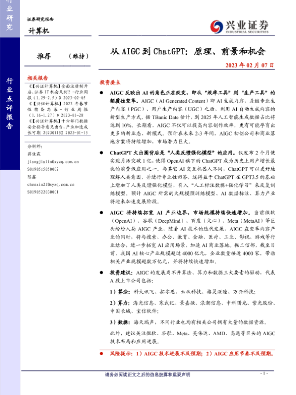 【兴业证券】【20230207】从 AIGC到 ChatGPT:原理、前景和机会-14页