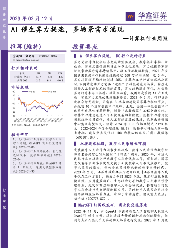 【华鑫证券】【20230212】20230212-华鑫证券-计算机行业周报:AI催生算力提速,多场景需求涌现-20页