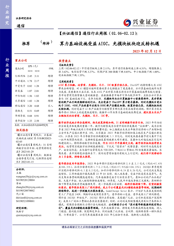 【兴业证券】【20230212】通信行业周报(02.06-02.12):算力基础设施受益AIGC,光模块板块迎反转机遇-16页