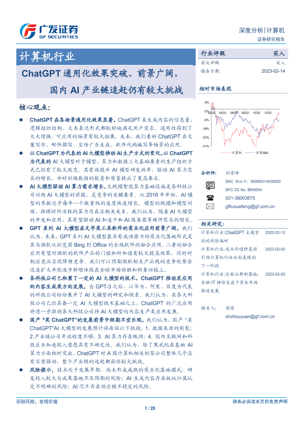 【广发证券】【20230214】计算机行业:ChatGPT通用化效果突破、前景广阔,国内AI产业链追赶仍有较大挑战-23页