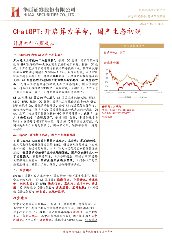 【华西证券】【20230218】20230218-华西证券-计算机行业周观点:ChatGPT:开启算力革命,国产生态初现-39页
