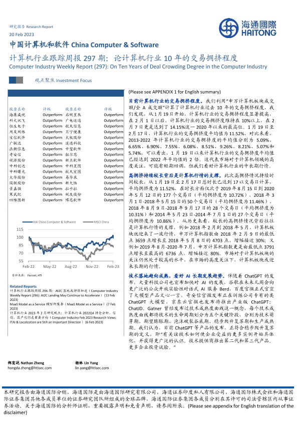 【海通国际】【20230220】计算机行业跟踪周报297期:论计算机行业10年的交易拥挤程度-11页