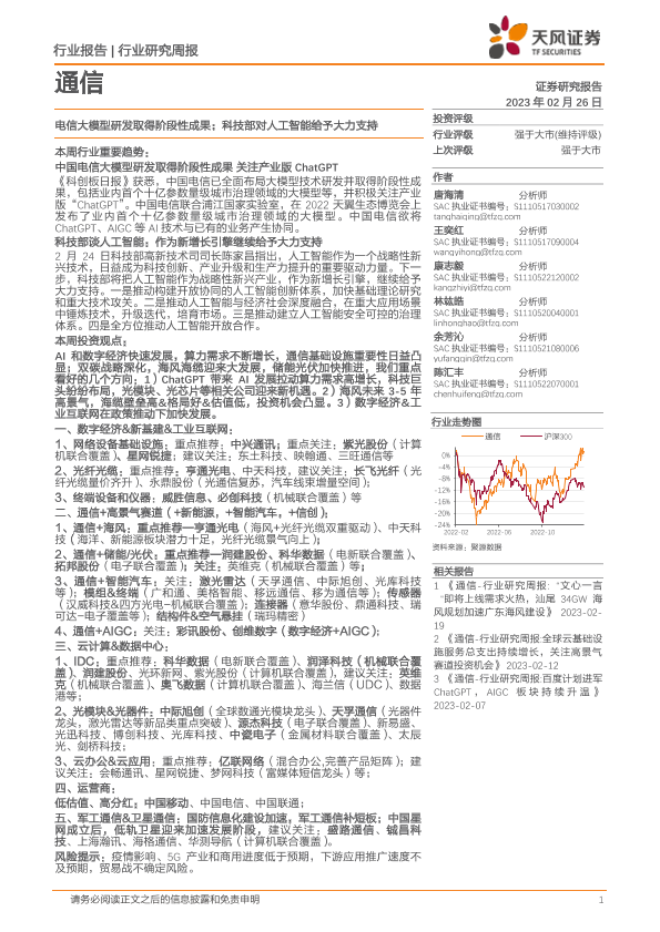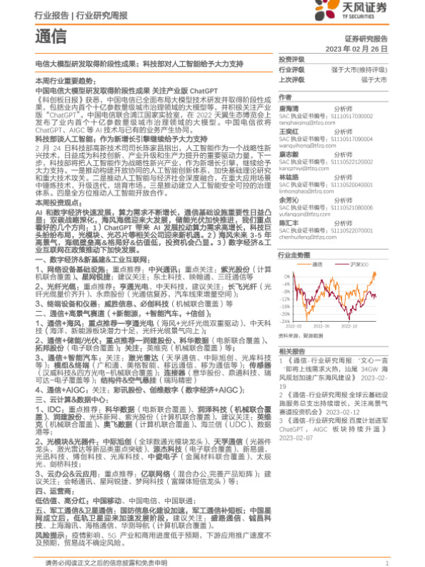 【天风证券】【20230226】通信行业研究周报:电信大模型研发取得阶段性成果;科技部对人工智能给予大力支持-13页