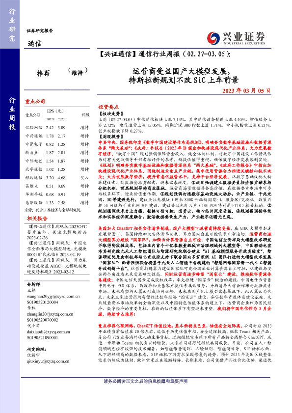 【兴业证券】【20230305】【兴证通信】通信行业周报(02.27-03.05):运营商受益国产大模型发展,特斯拉新规划不改SiC上车前景-19页