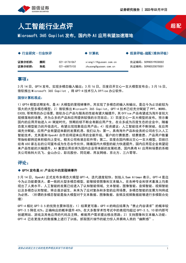 【国信证券】【20230319】20230319-国信证券-人工智能行业点评:Microsoft 365 Copilot发布,国内外AI应用有望加速落地-12页