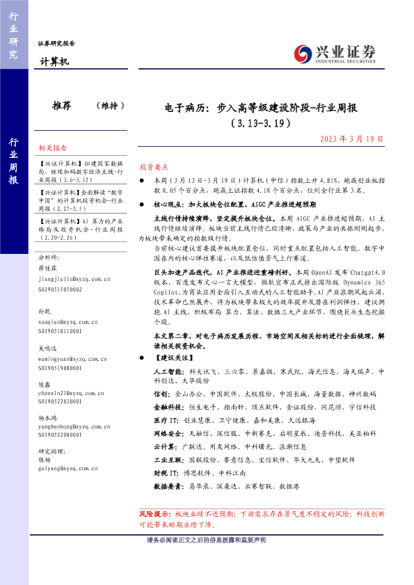 AI产业 政策催化 电子病历 计算机行业 高等级建设