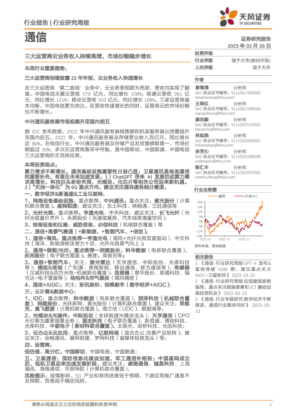 【天风证券】【20230326】通信行业研究周报:三大运营商云业务收入持续高增,市场份额稳步增长-13页