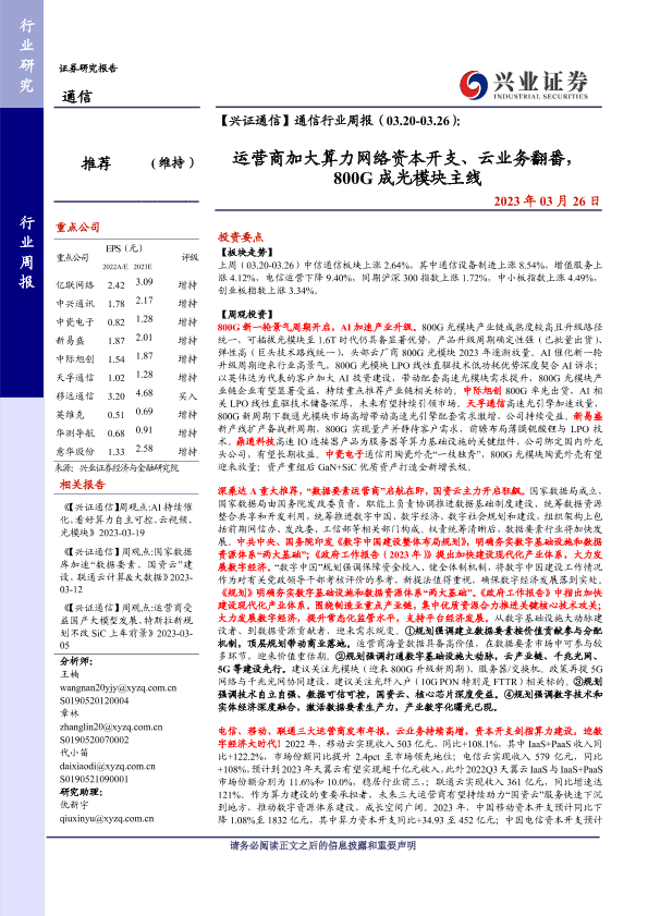 【兴业证券】【20230326】通信行业周报:运营商加大算力网络资本开支、云业务翻番,800G成光模块主线-20页