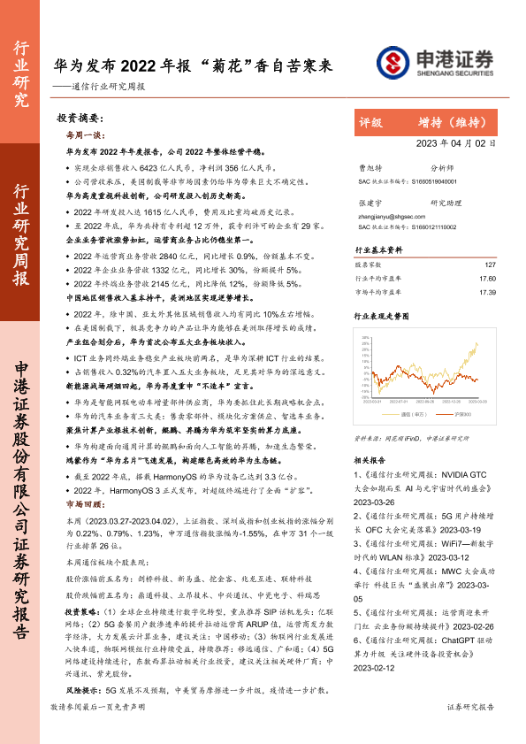 【申港证券】【20230402】通信行业研究周报:华为发布2022年报“菊花”香自苦寒来-13页