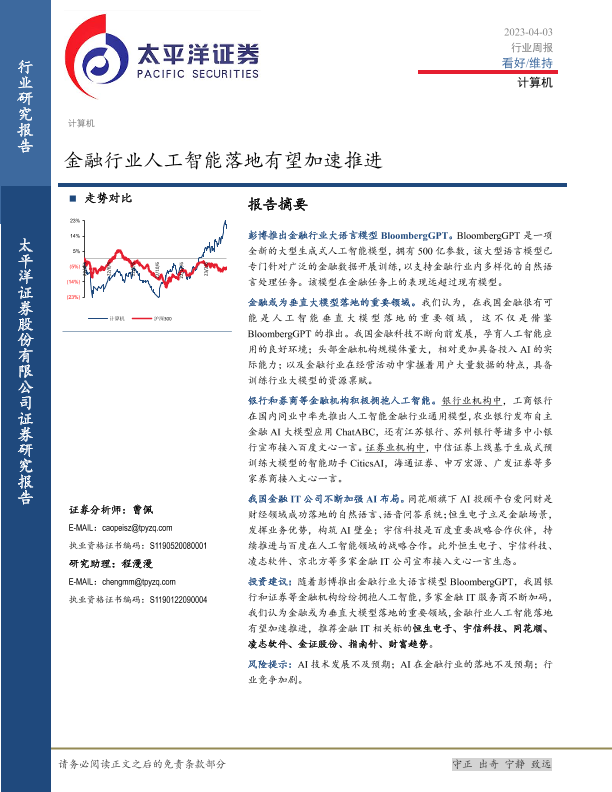 【太平洋证券】【20230403】计算机行业周报:金融行业人工智能落地有望加速推进-15页