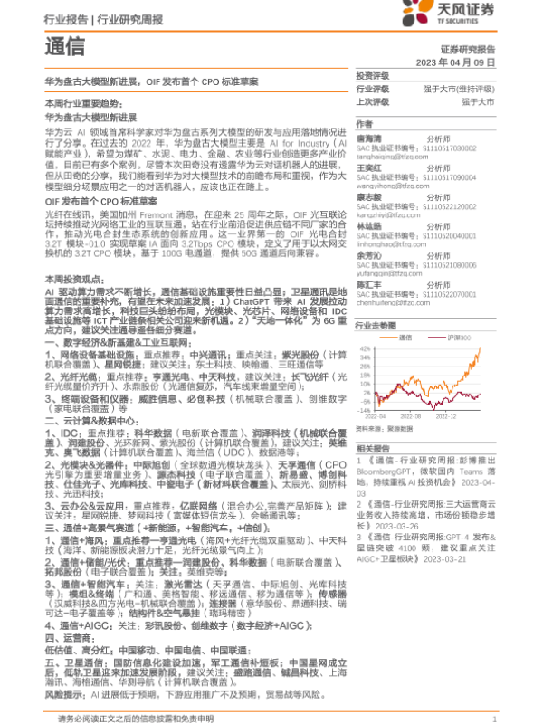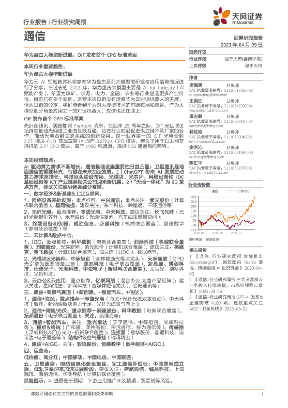 【天风证券】【20230409】通信行业研究周报:华为盘古大模型新进展,OIF发布首个CPO标准草案-13页