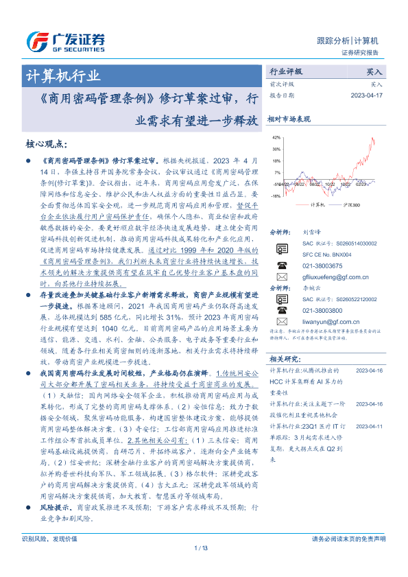 【广发证券】【20230417】20230417-广发证券-计算机行业跟踪分析:《商用密码管理条例》修订草案过审,行业需求有望进一步释放-13页