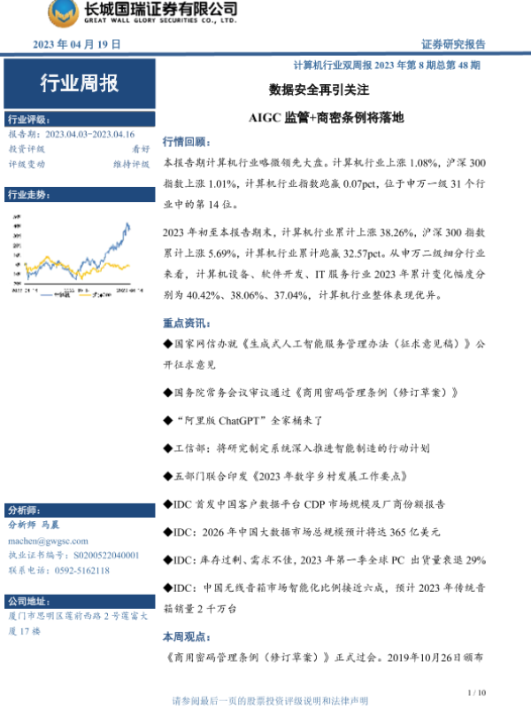 【长城国瑞证券】【20230419】计算机行业双周报2023年第8期总第48期:数据安全再引关注 AIGC监管+商密条例将落地-10页