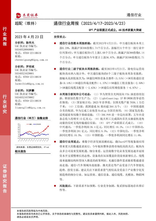 【东莞证券】【20230423】20230423-东莞证券-通信行业周报:GPT产业联盟正式成立,6G技术获重大突破-12页