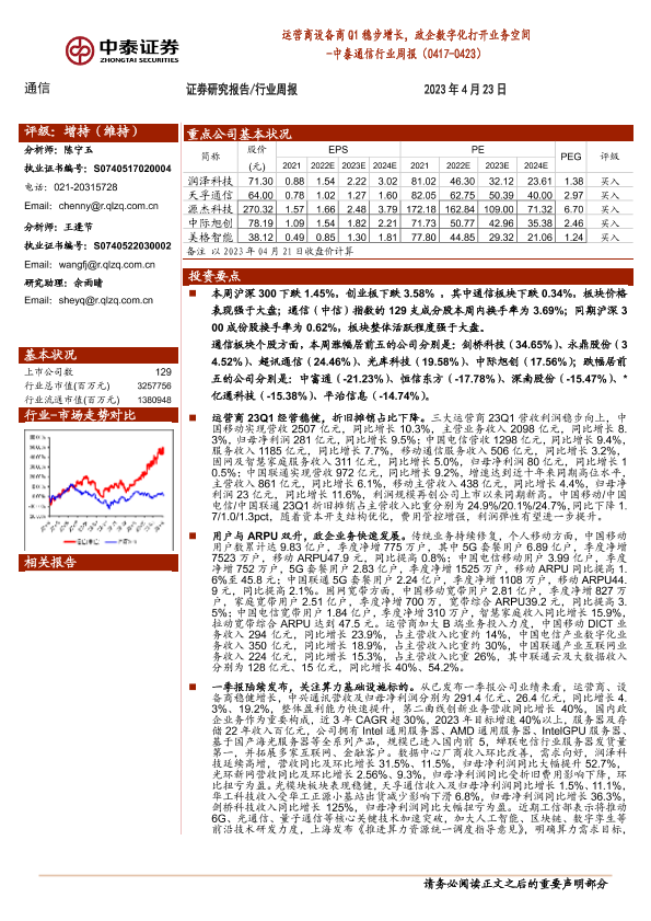【中泰证券】【20230423】中泰证券-中泰通信行业周报:运营商设备商Q1稳步增长,政企数字化打开业务空间-27页