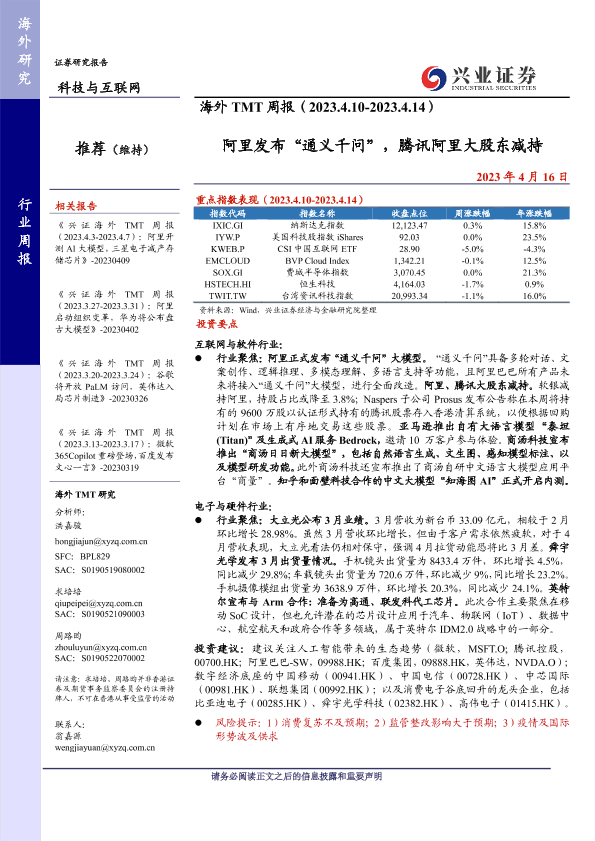 【兴业证券】【20230416】海外TMT周报:阿里发布“通义千问”,腾讯阿里大股东减持-19页