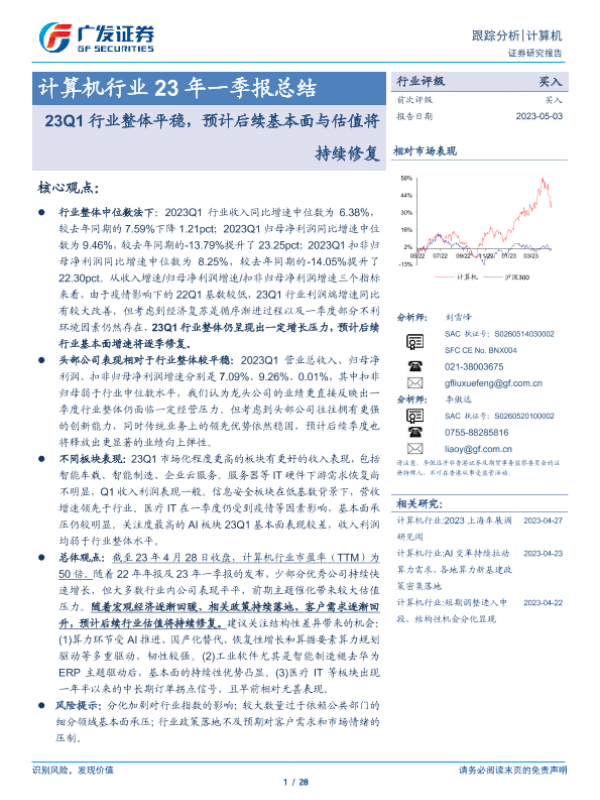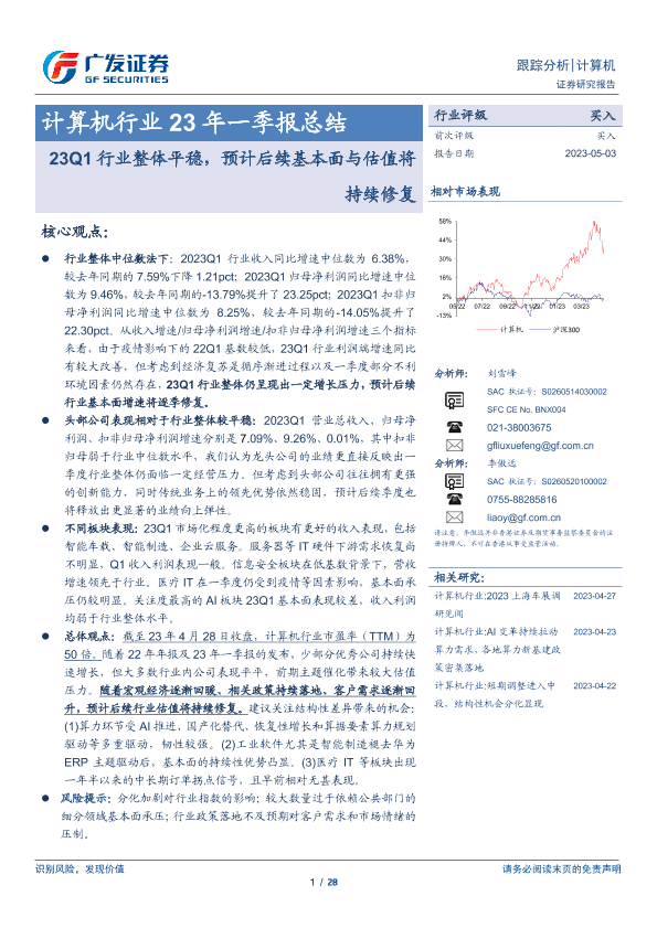 【广发证券】【20230503】20230503-广发证券-计算机行业23年一季报总结:23Q1行业整体平稳,预计后续基本面与估值将持续修复-28页