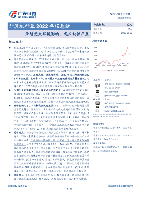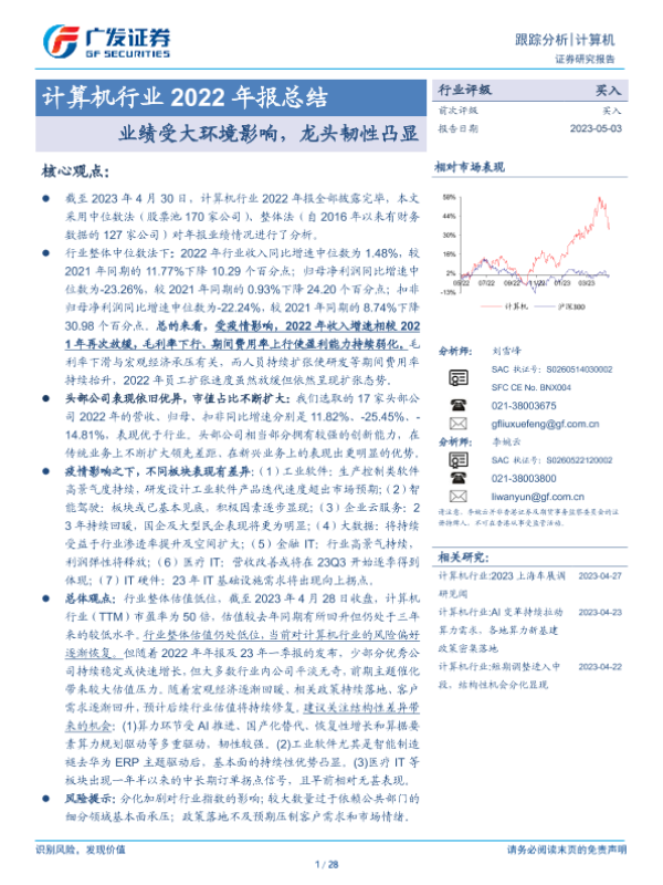 【广发证券】【20230503】计算机行业2022年报总结:业绩受大环境影响,龙头韧性凸显-28页