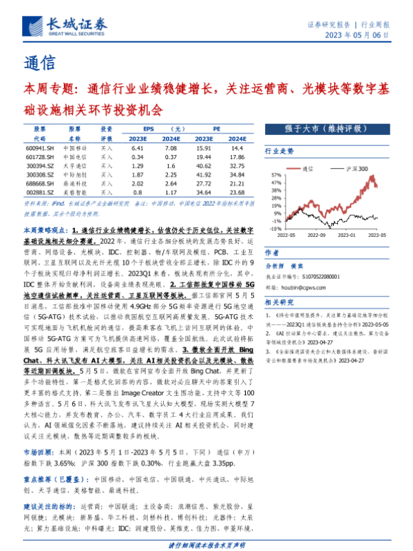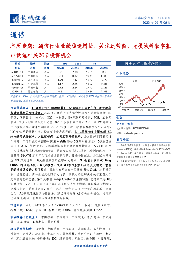 【长城证券】【20230506】20230506-长城证券-通信本周专题:通信行业业绩稳健增长,关注运营商、光模块等数字基础设施相关环节投资机会-20页