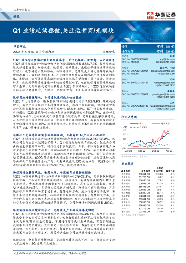 【华泰证券】【20230507】20230507-华泰证券-通信专题研究:Q1业绩延续稳健,关注运营商 光模块-17页