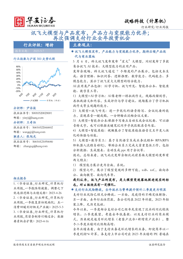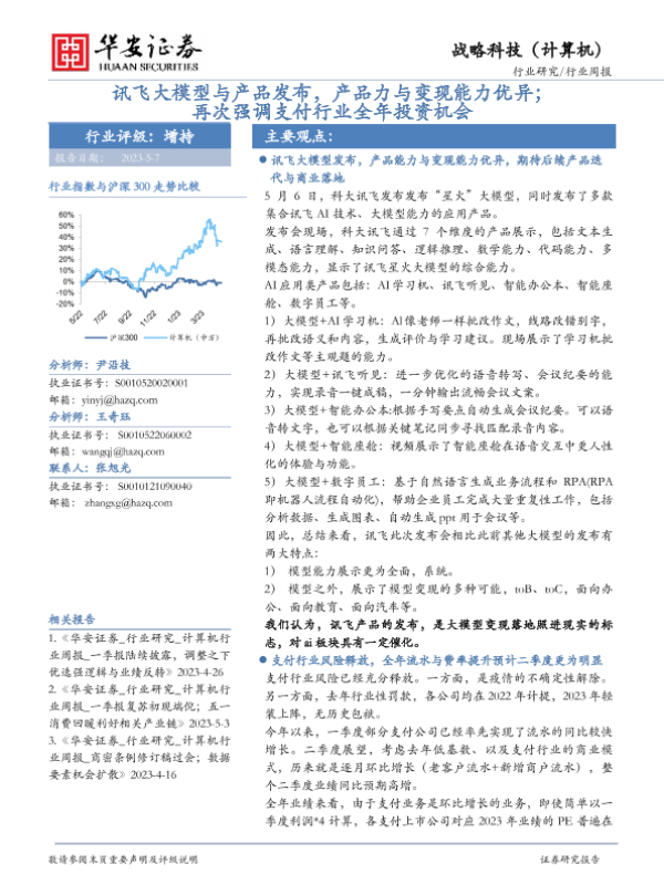 【华安证券】【20230507】20230507-华安证券-计算机行业周报:讯飞大模型与产品发布,产品力与变现能力优异;再次强调支付行业全年投资机会-16页