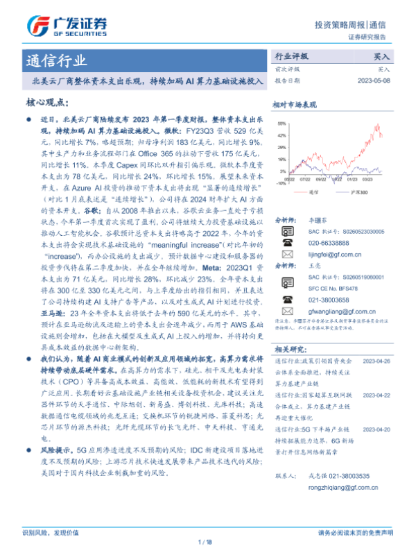 【广发证券】【20230508】20230508-广发证券-通信行业投资策略周报:北美云厂商整体资本支出乐观,持续加码AI算力基础设施投入-18页