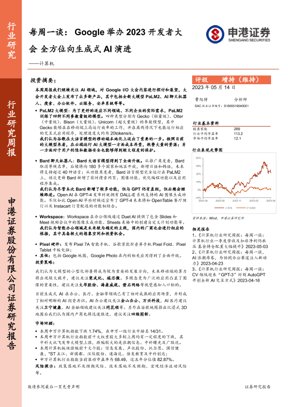 【申港证券】【20230514】计算机每周一谈:Google举办2023开发者大会 全方位向生成式AI演进-13页