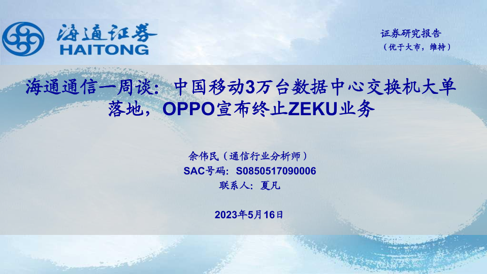 【海通证券】【20230516】海通通信一周谈:中国移动3万台数据中心交换机大单落地,OPPO宣布终止ZEKU业务-11页