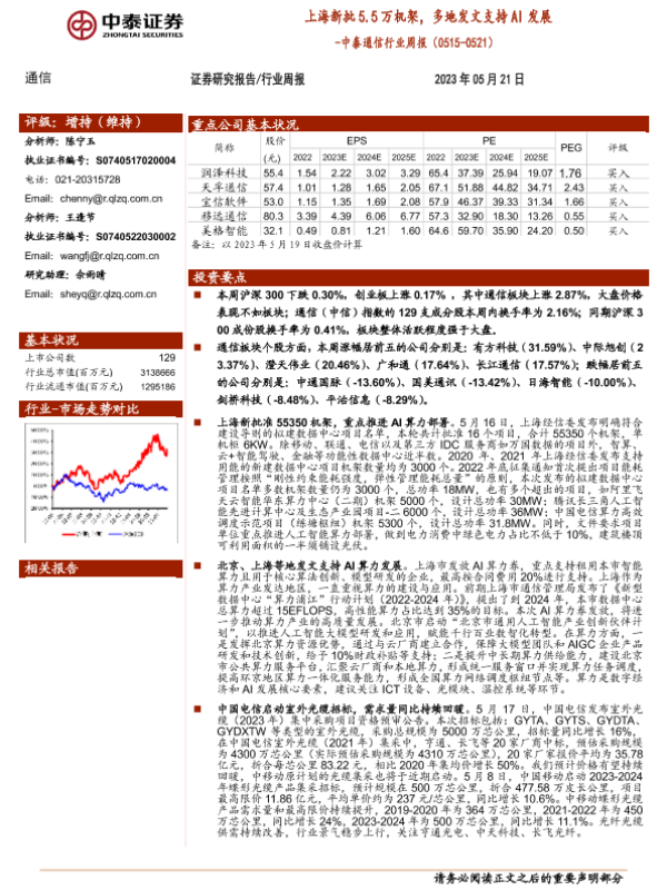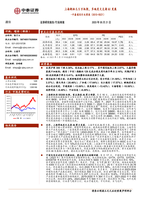 【中泰证券】【20230521】20230521-中泰证券-通信行业周报:上海新批5.5万机架,多地发文支持AI发展-17页