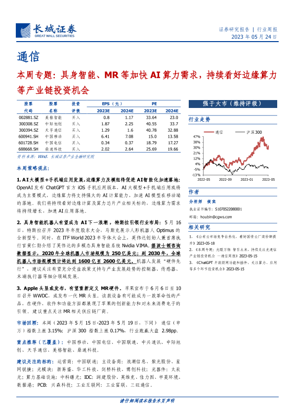 【长城证券】【20230524】通信本周专题:具身智能、MR等加快AI算力需求,持续看好边缘算力等产业链投资机会-16页