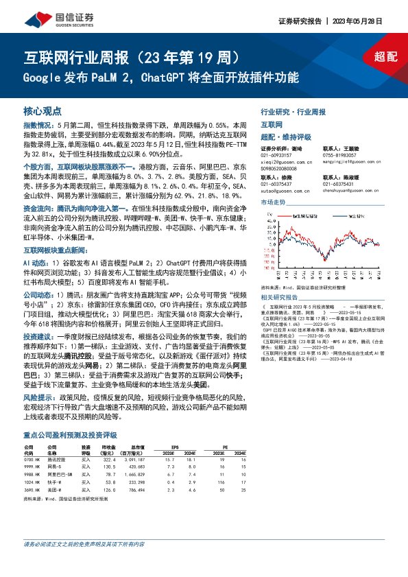 【国信证券】【20230528】互联网行业周报(23年第19周):Google发布PaLM 2,ChatGPT将全面开放插件功能-13页
