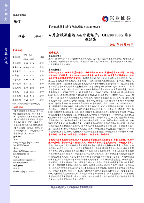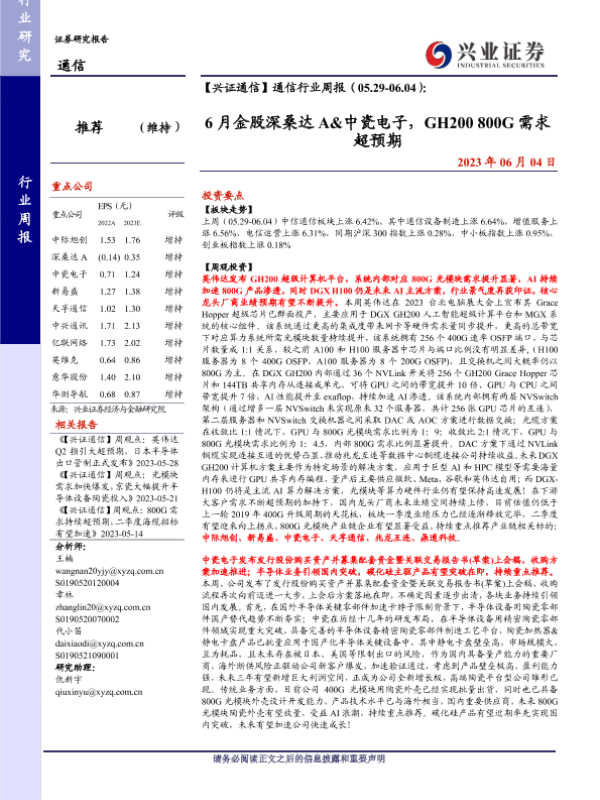 【兴业证券】【20230604】通信行业周报:6月金股深桑达A&中瓷电子,GH200 800G需求超预期-23页