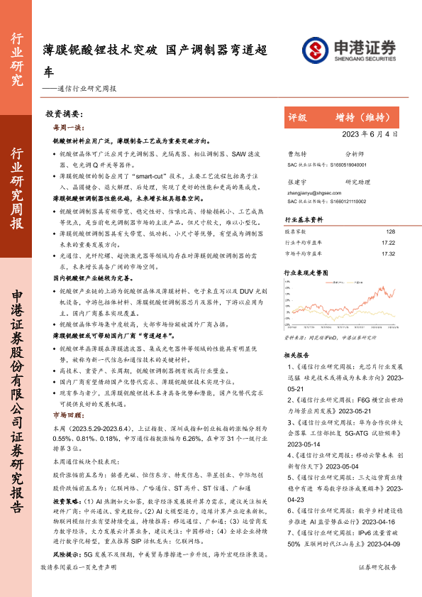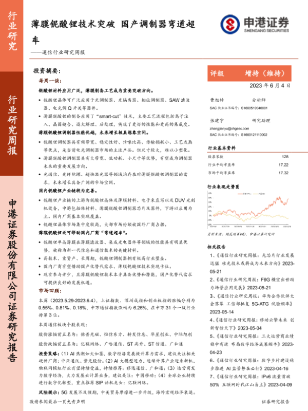 【申港证券】【20230604】通信行业研究周报:薄膜铌酸锂技术突破 国产调制器弯道超车-13页
