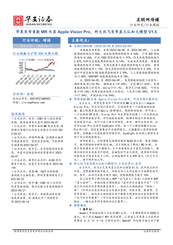 【华安证券】【20230611】20230611-华安证券-互联网传媒行业周报:苹果发布首款MR头显Apple Vision Pro,科大讯飞发布星火认知大模型V1.5-34页
