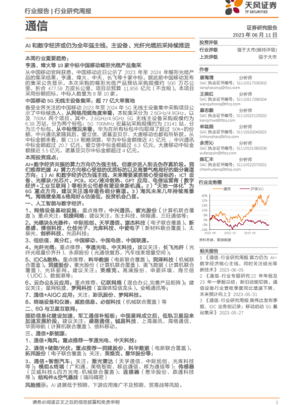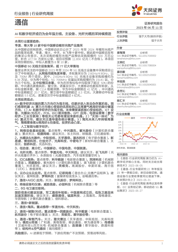 【天风证券】【20230611】20230611-天风证券-通信行业研究周报:AI和数字经济或仍为全年强主线,主设备、光纤光缆招采持续推进-13页