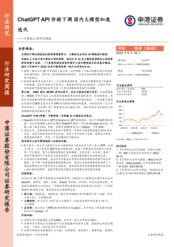 【申港证券】【20230618】计算机行业研究周报:ChatGPT API价格下调国内大模型加速迭代-11页