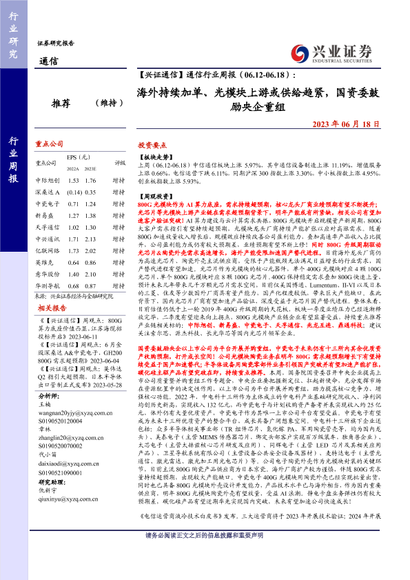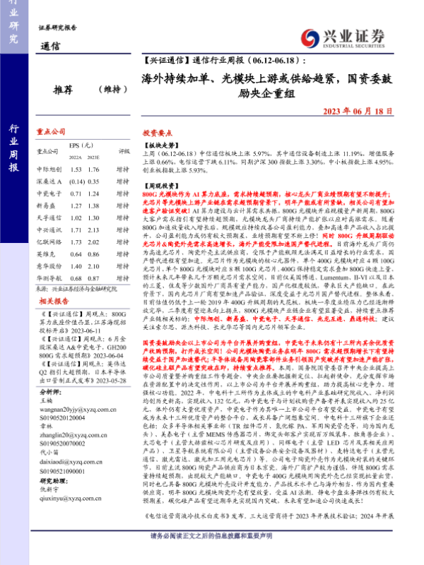 【兴业证券】【20230618】20230618-兴业证券-通信行业周报:海外持续加单、光模块上游或供给趋紧,国资委鼓励央企重组-23页