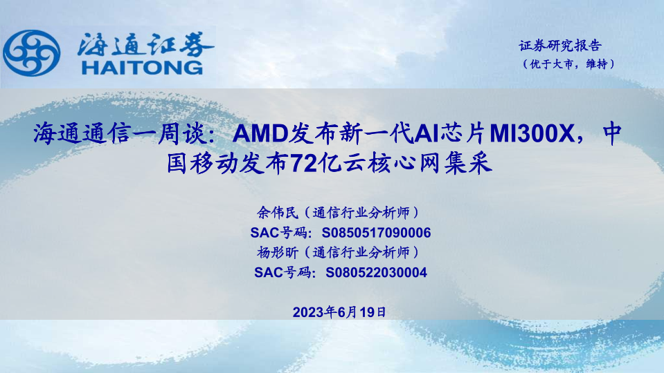 【海通证券】【20230619】海通通信一周谈:AMD发布新一代AI芯片MI300X,中国移动发布72亿云核心网集采-11页