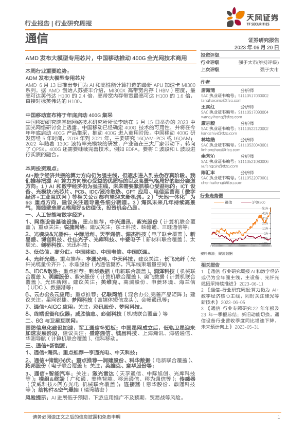 【天风证券】【20230620】20230620-天风证券-通信行业研究周报:AMD发布大模型专用芯片,中国移动推动400G全光网技术商用-14页