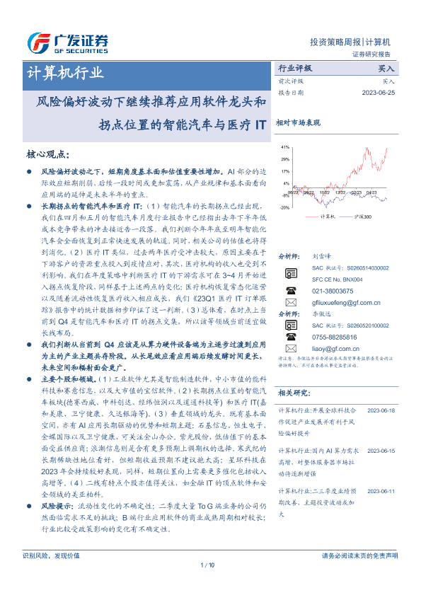 【广发证券】【20230625】20230625-广发证券-计算机行业:风险偏好波动下继续推荐应用软件龙头和拐点位置的智能汽车与医疗IT-10页